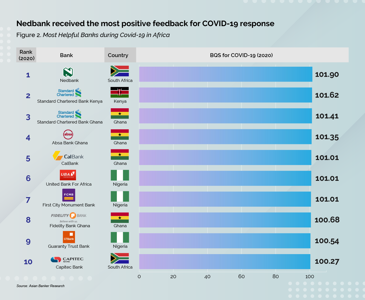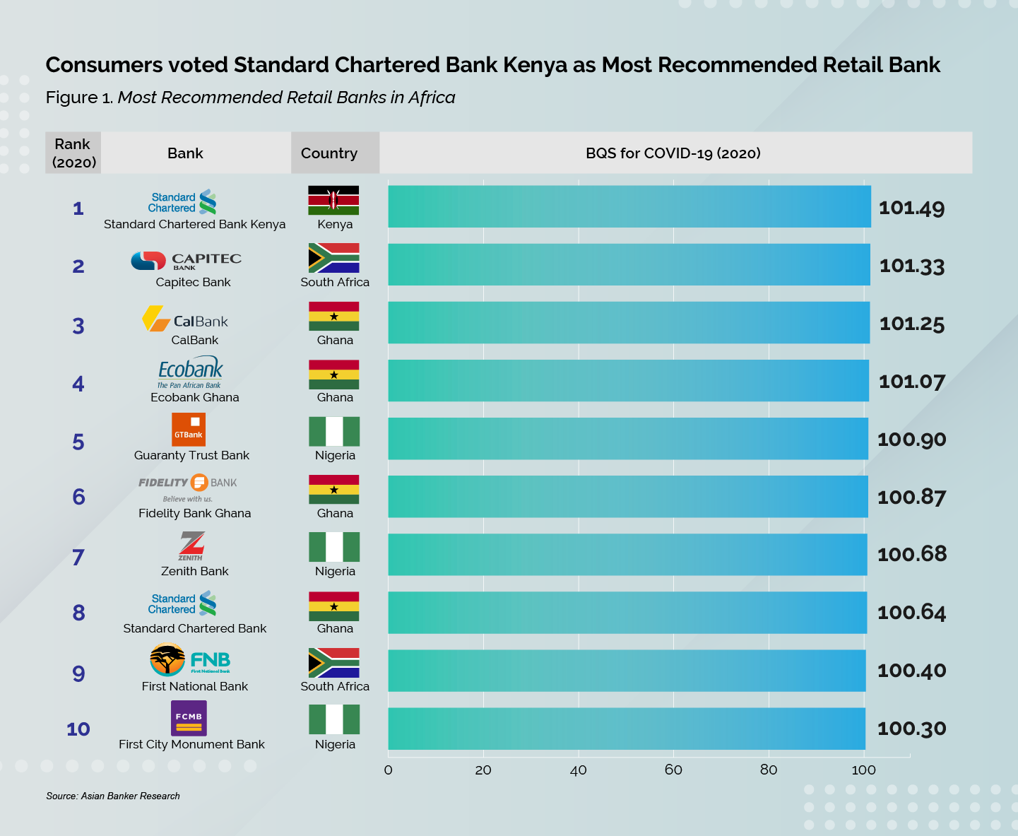 South Africa’s Capitec Bank (BQS 101.33), Ghana’s CalBank (BQS 101.25) and Nigeria’s Guaranty Trust Bank (BQS 100.90) are the other top players in their respective markets. These banks received the highest overall ratings for Most Recommended Retail Bank by country.