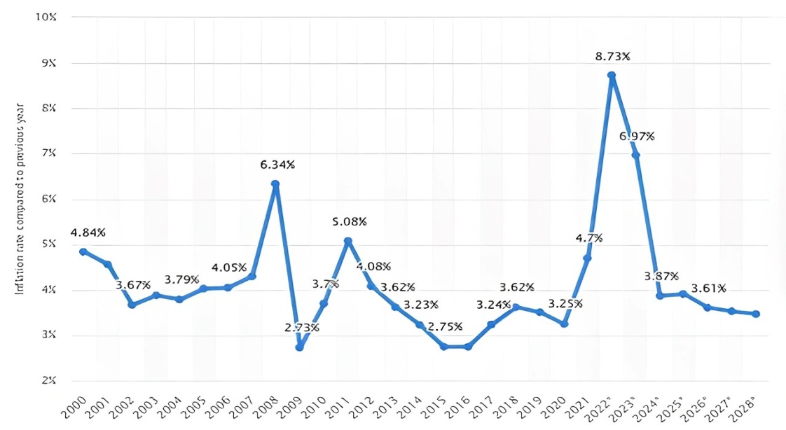 Figure 1: Global inflation rate from 2000 to 2023, with projections until 2028
